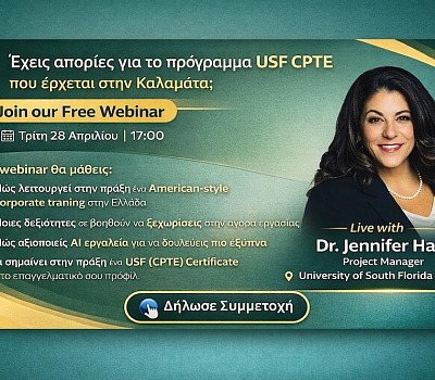 Ένα διεθνές πρόγραμμα εκπαίδευσης έρχεται στην Καλαμάτα – Δωρεάν webinar γνωριμίας με το USF CPTE Σε μια περίοδο όπου η αγορά εργασίας μετασχηματίζεται δυναμικά και οι απαιτήσεις για σύγχρονες… Περισσότερα
