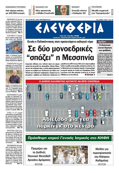Βουλευτές Ενιαία η Πελοπόννησος στον προτεινόμενο εκλογικό νόμο: Σε δύο μονοεδρικές “σπάζει” η Μεσσηνία 21/04/2026 09:22
