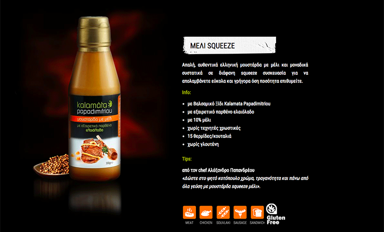 Στο συγκεκριμένο εργοστάσιο παράγονται και συσκευάζονται όλες οι κατηγορίες προϊόντων της εταιρείας (Μουστάρδες, Βαλσάμικο ξίδι, Ελαιόλαδο, Σταφίδες), σε συσκευασίες retail και Food Service.