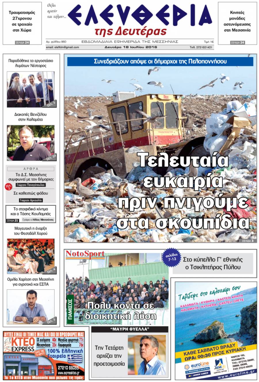 Το πρωτοσέλιδο της "Ελευθερίας της Δευτέρας" 18 Ιουλίου 2016 Για να κατεβάσετε το αρχείο πατήστε πάνω στο κουμπί που γράφει download pdf