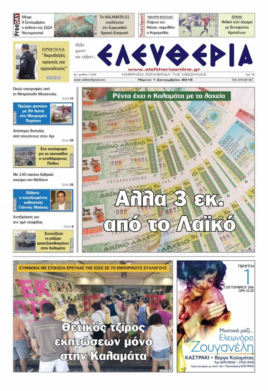 Το πρωτοσέλιδο της "Ελευθερίας" Πέμπτη 1 Σεπτεμβρίου 2016 Για να κατεβάσετε το αρχείο πατήστε πάνω στο κουμπί που γράφει download pdf