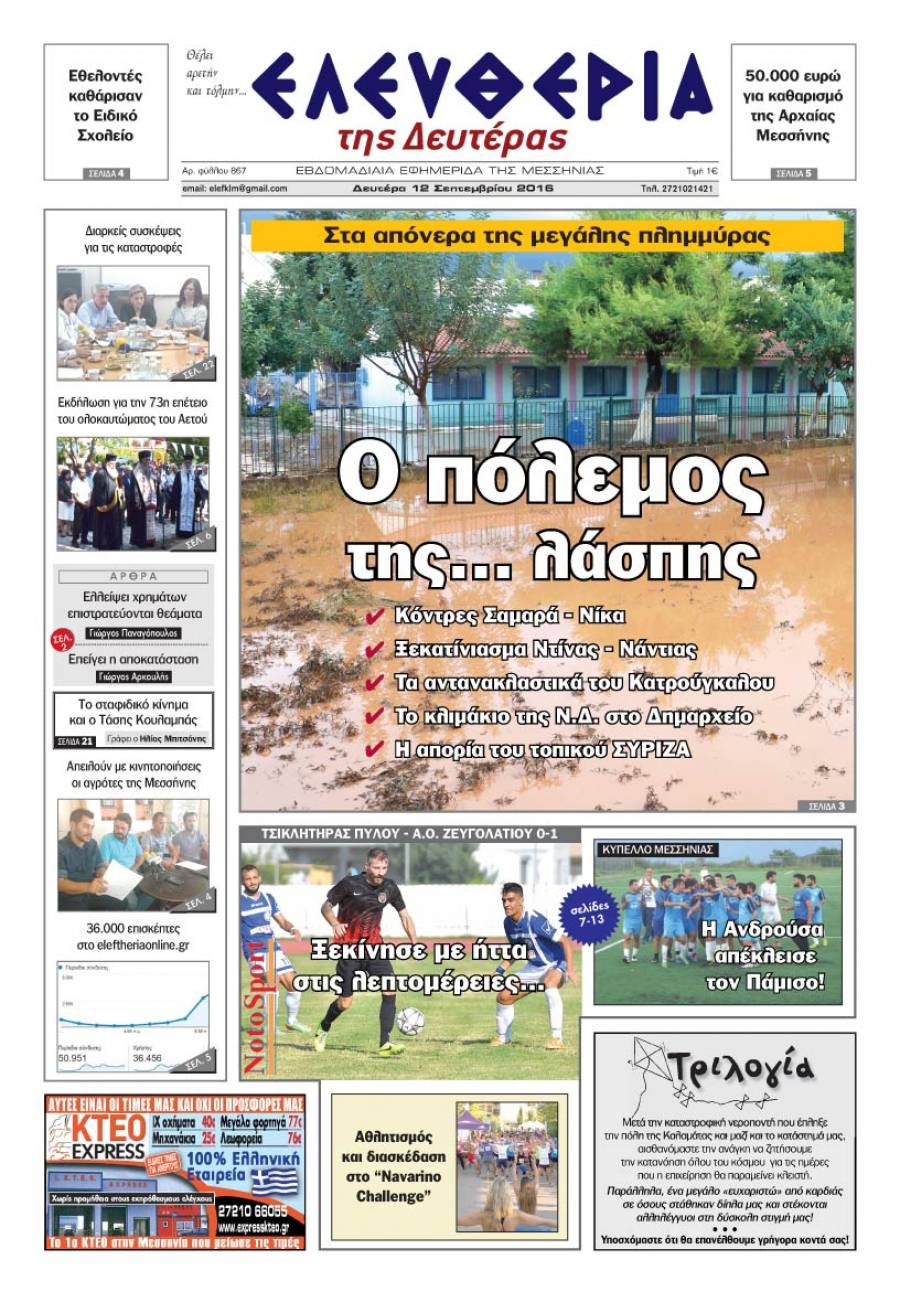 Το πρωτοσέλιδο της "Ελευθερίας της Δευτέρας" - 12 Σεπτεμβρίου 2016