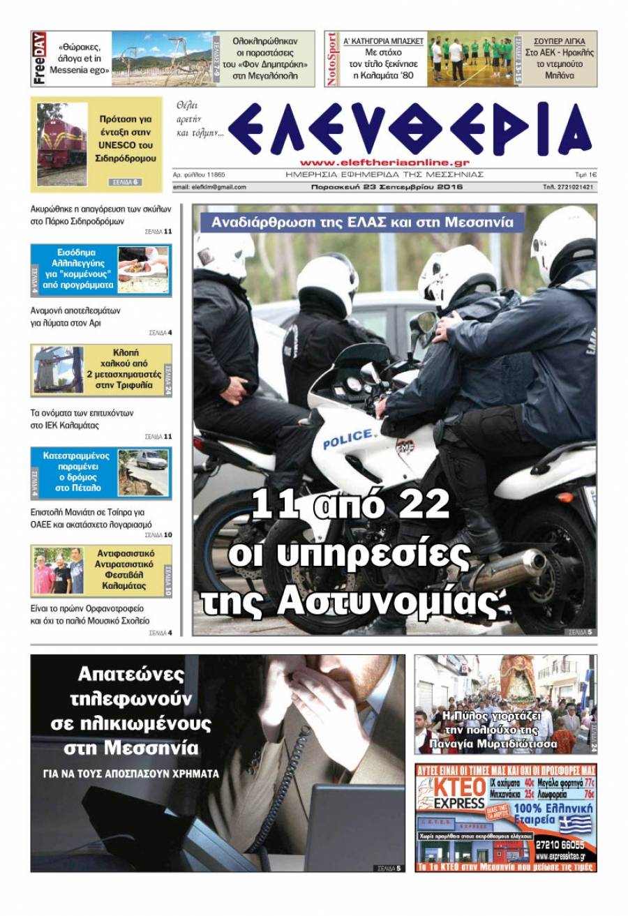 Το πρωτοσέλιδο της "Ελευθερίας" Παρασκευή 23 Σεπτεμβρίου 2016