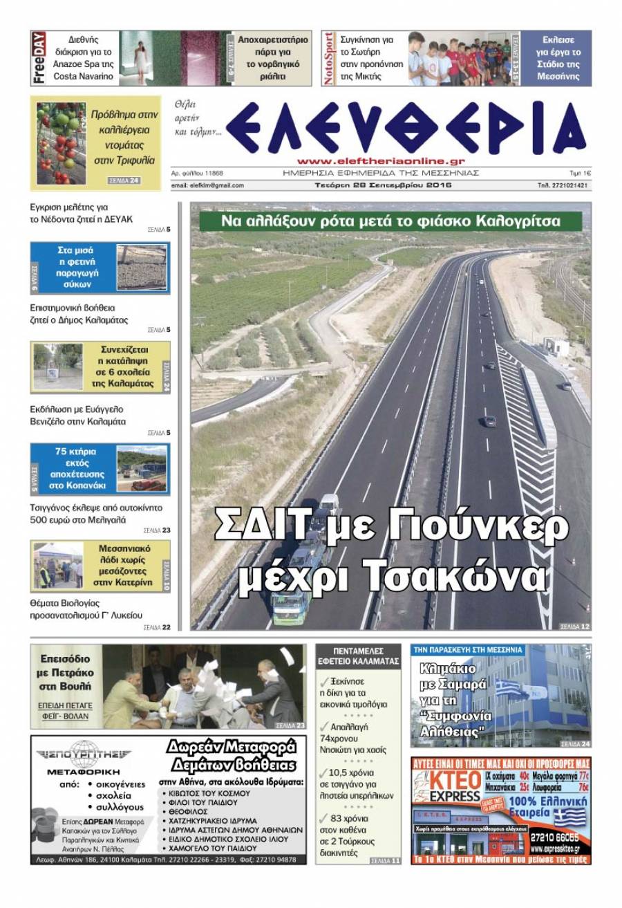 Το πρωτοσέλιδο της "Ελευθερίας" - Τετάρτη 28 Σεπτεμβρίου 2016 Για να κατεβάσετε το αρχείο πατήστε πάνω στο κουμπί που γράφει download pdf