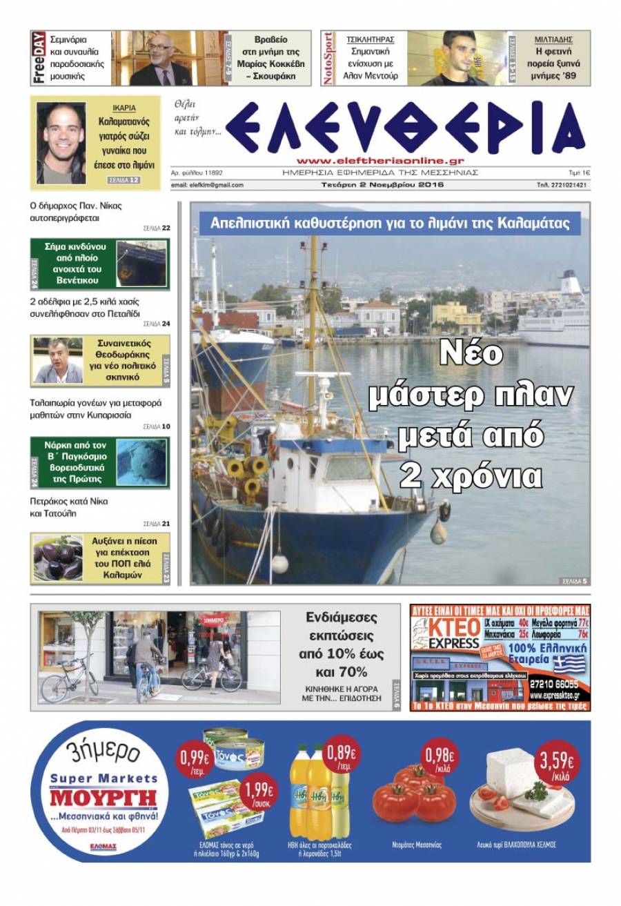 Το πρωτοσέλιδο της "Ελευθερίας" - Τετάρτη 2 Νοεμβρίου 2016 Για να κατεβάσετε το αρχείο πατήστε πάνω στο κουμπί που γράφει download pdf
