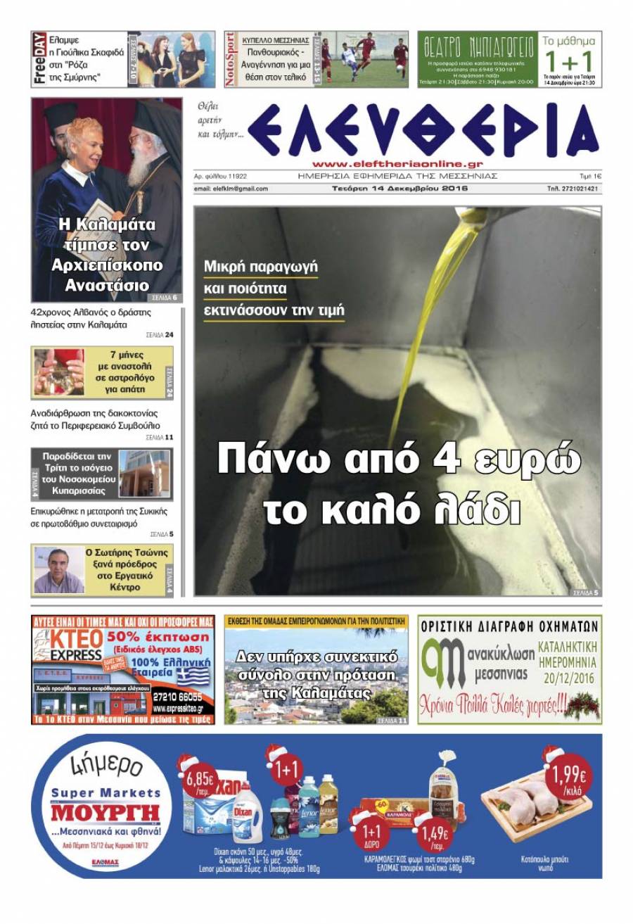 Το πρωτοσέλιδο της "Ελευθερίας" Tετάρτη 14 Δεκεμβρίου 2016 Για να κατεβάσετε το αρχείο πατήστε πάνω στο κουμπί που γράφει download pdf