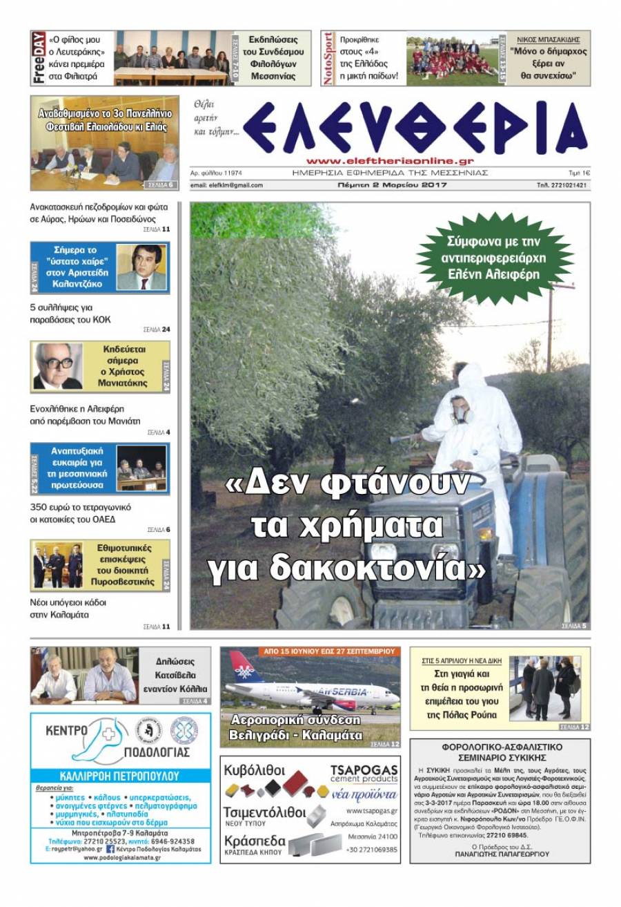 Το πρωτοσέλιδο της "Ελευθερίας" - Πέμπτη 2 Μαρτίου 2017 Για να κατεβάσετε το αρχείο πατήστε πάνω στο κουμπί που γράφει download pdf