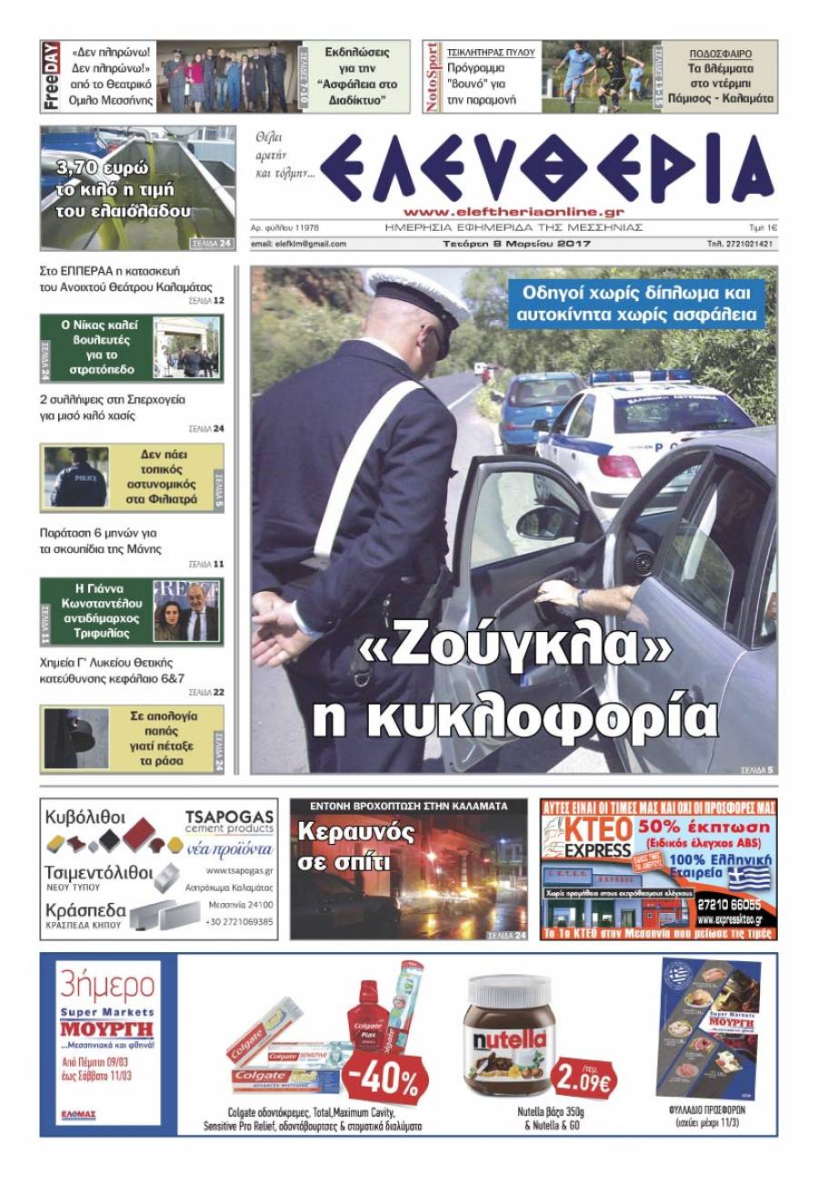 Το πρωτοσέλιδο της "Ελευθερίας" - Τετάρτη 8 Μαρτίου 2017 Για να κατεβάσετε το αρχείο πατήστε πάνω στο κουμπί που γράφει download pdf