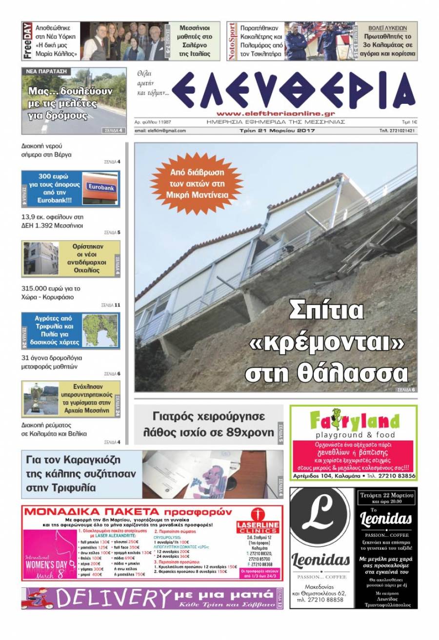 Το πρωτοσέλιδο της "Ελευθερίας" - Τρίτη 21 Μαρτίου 2017 Για να κατεβάσετε το αρχείο πατήστε πάνω στο κουμπί που γράφει download pdf