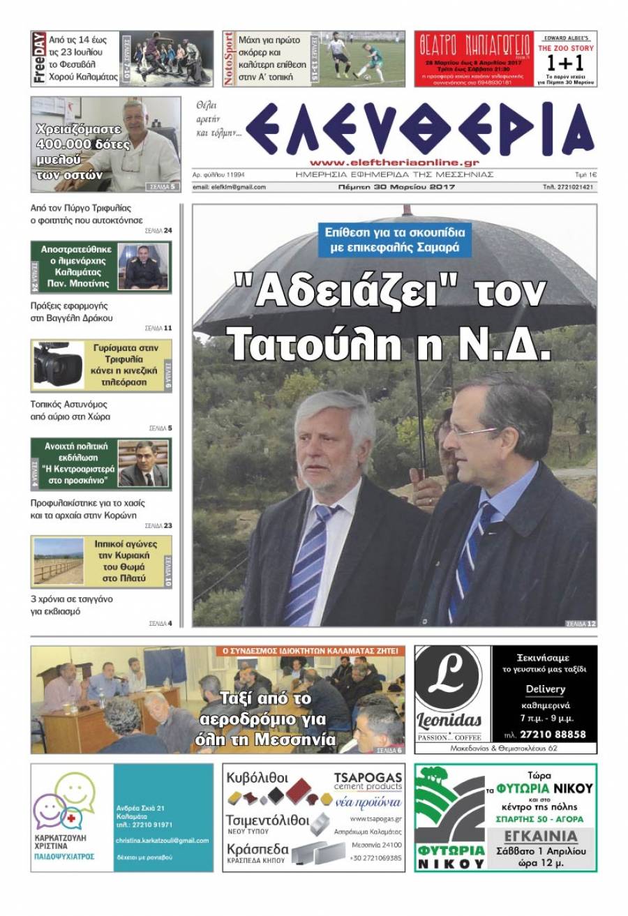 Το πρωτοσέλιδο της "Ελευθερίας" - Πέμπτη 30 Μαρτίου 2017 Για να κατεβάσετε το αρχείο πατήστε πάνω στο κουμπί που γράφει download pdf