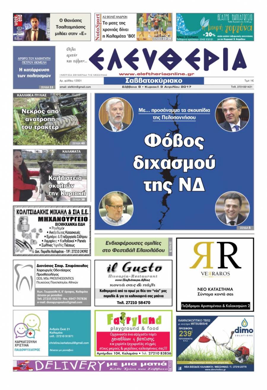 Το πρωτοσέλιδο της "Ελευθερίας Σαββατοκύριακο" 8 - 9 Απριλίου 2017