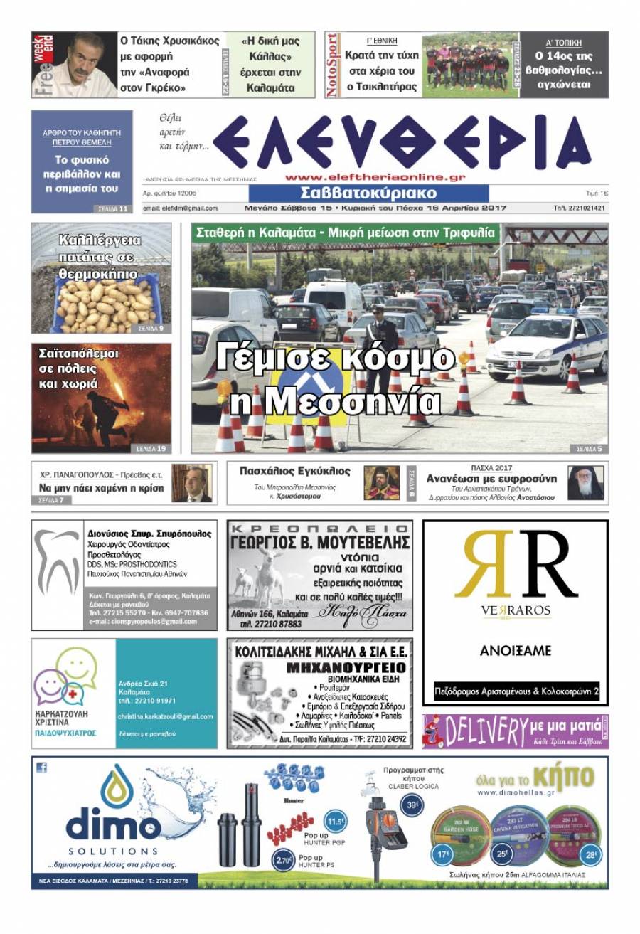 Το πρωτοσέλιδο της "Ελευθερίας Σαββατοκύριακο" 15-16 Απριλίου 2017