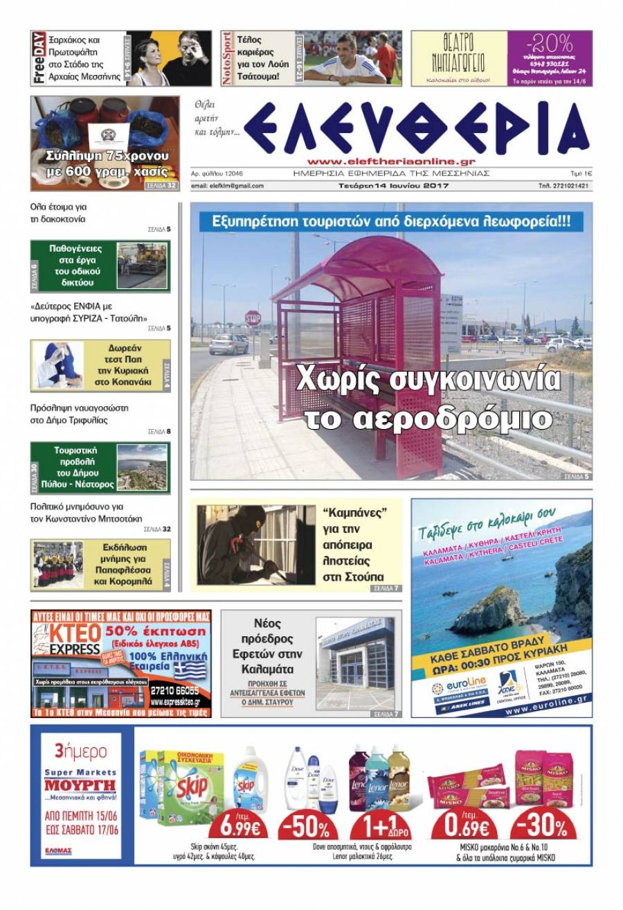Το πρωτοσέλιδο της "Ελευθερίας" - Τετάρτη 14 Ιουνίου 2017 Για να κατεβάσετε το αρχείο πατήστε πάνω στο κουμπί που γράφει download pdf