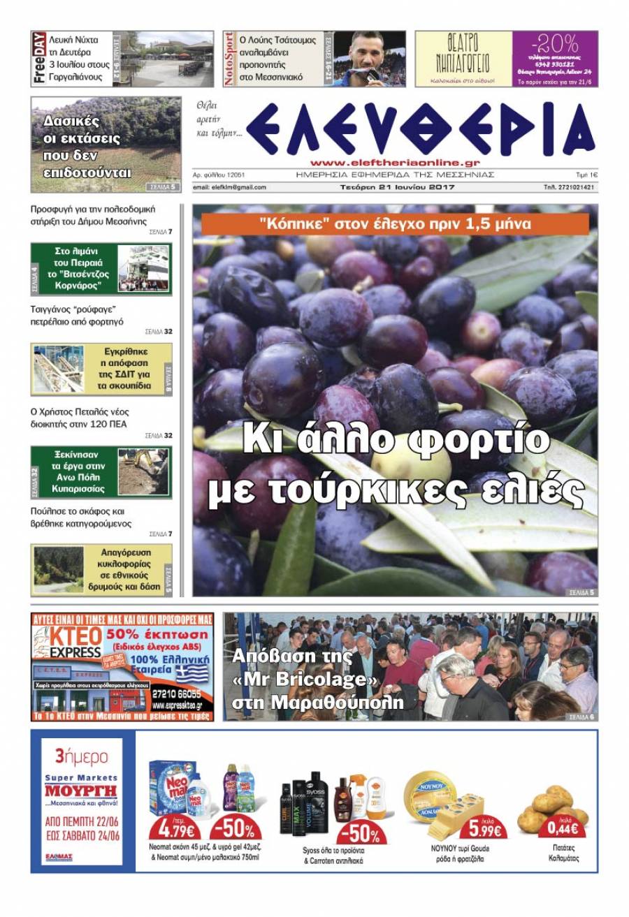 Το πρωτοσέλιδο της "Ελευθερίας" - Τετάρτη 21 Ιουνίου 2017 Για να κατεβάσετε το αρχείο πατήστε πάνω στο κουμπί που γράφει download pdf
