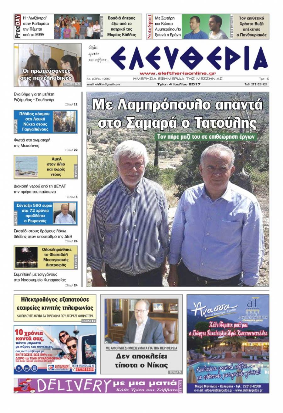 Το πρωτοσέλιδο της "Ελευθερίας" - Τρίτη 4 Ιουλίου 2017 Για να κατεβάσετε το αρχείο πατήστε πάνω στο κουμπί που γράφει download pdf