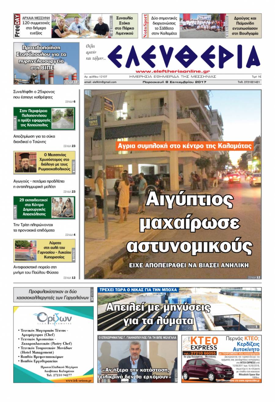 Το πρωτοσέλιδο της "Ελευθερίας" - Παρασκευή 8 Σεπτεμβρίου 2017