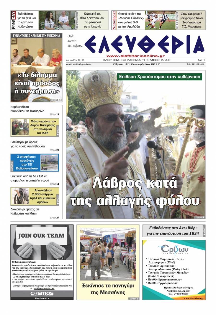 Το πρωτοσέλιδο της "Ελευθερίας" - Πέμπτη 21 Σεπτεμβρίου 2017 Για να κατεβάσετε το αρχείο πατήστε πάνω στο κουμπί που γράφει download pdf