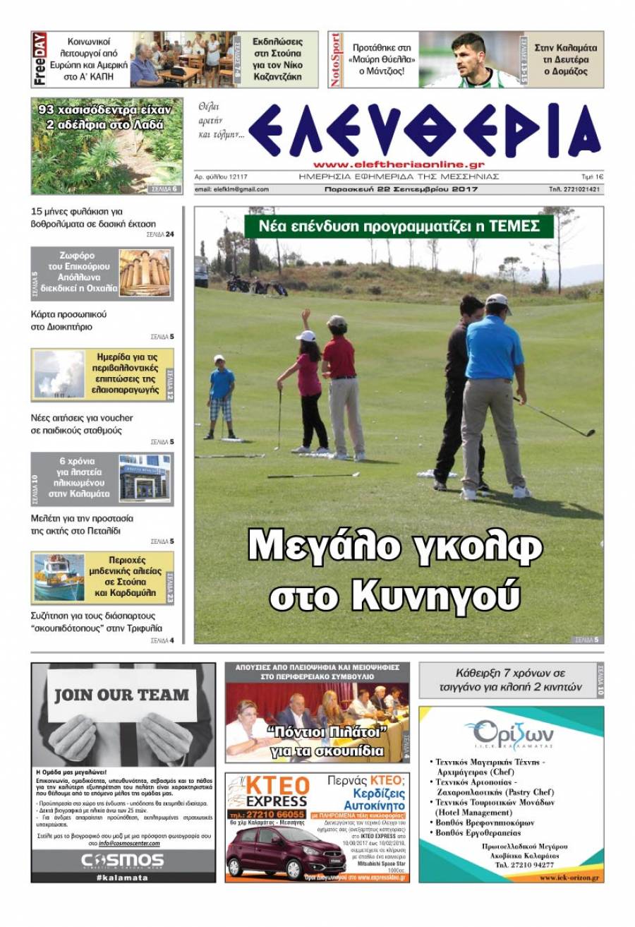 Το πρωτοσέλιδο της "Ελευθερίας" Παρασκευή 22 Σεπτεμβρίου 2017