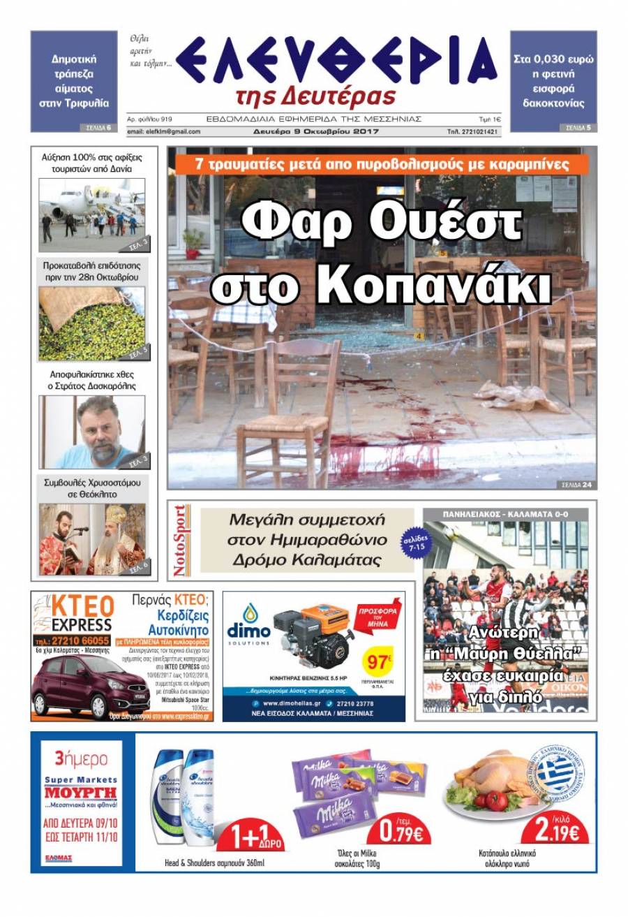 Το πρωτοσέλιδο της "Ελευθερίας της Δευτέρας" - 9 Οκτωβρίου 2017 Για να κατεβάσετε το αρχείο πατήστε πάνω στο κουμπί που γράφει download pdf