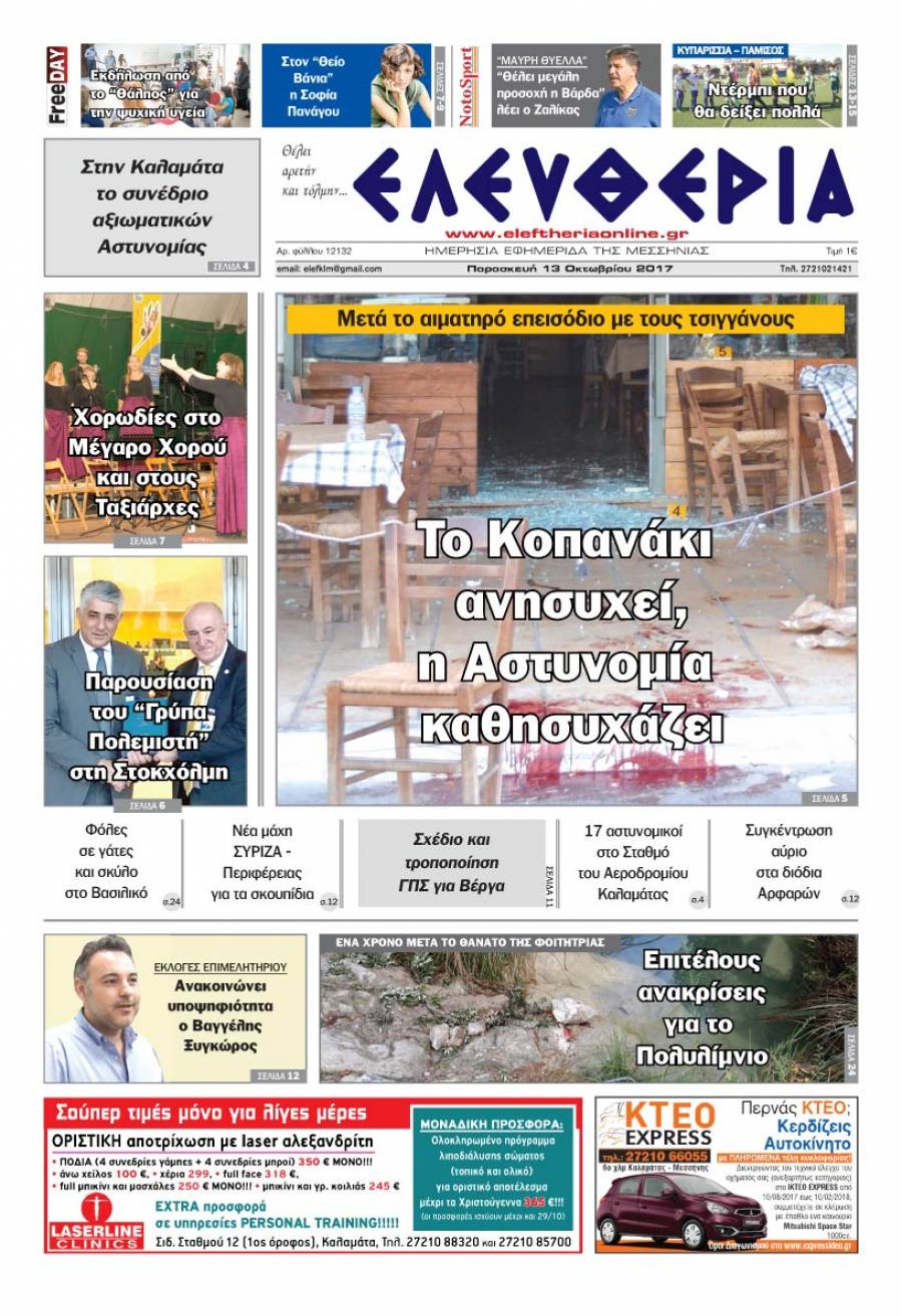 Το πρωτοσέλιδο της "Ελευθερίας" - Παρασκευή 13 Οκτωβρίου 2017 Για να κατεβάσετε το αρχείο πατήστε πάνω στο κουμπί που γράφει download pdf