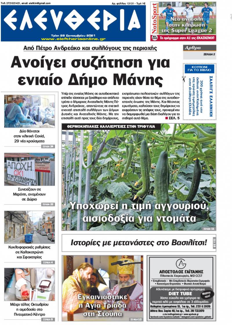 Το πρωτοσέλιδο της "Ελευθερίας" - Τρίτη 28 Σεπτεμβρίου 2021 Για να κατεβάσετε το αρχείο πατήστε πάνω στο κουμπί που γράφει download pdf