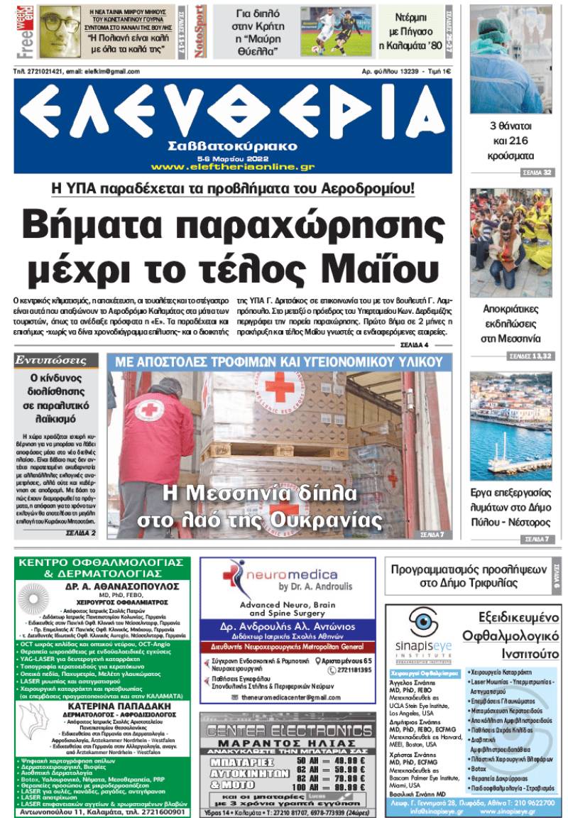 Το πρωτοσέλιδο της "Ελευθερίας Σαββατοκύριακο" 5-6 Μαρτίου 2022 Για να κατεβάσετε το αρχείο πατήστε πάνω στο κουμπί που γράφει download pdf
