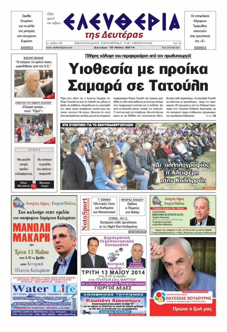 Το πρωτοσέλιδο της "Ελευθερίας" της Δευτέρας 12 Μαΐου 2014 Για να κατεβάσετε το αρχείο πατήστε πάνω στο κουμπί που γράφει download pdf