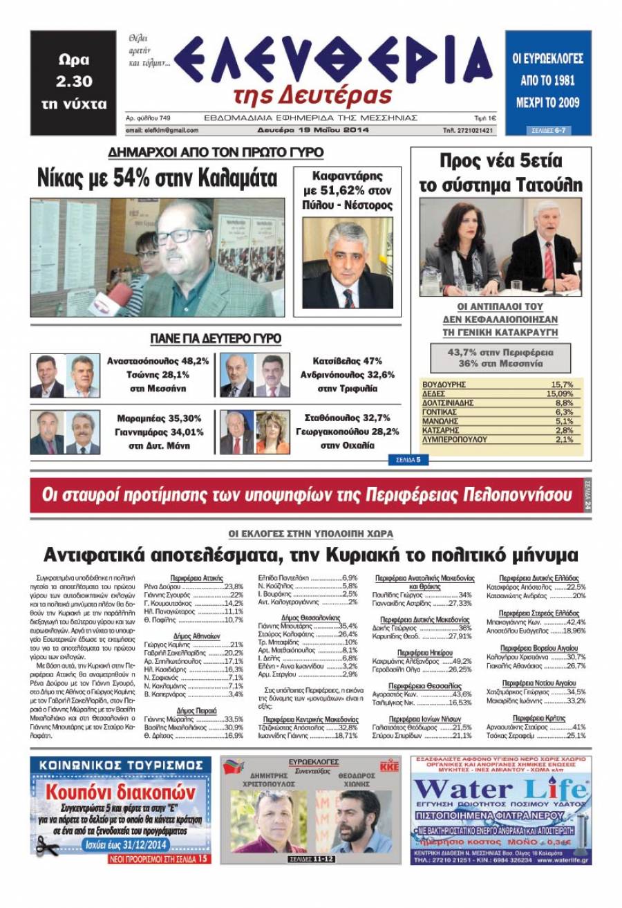 Το πρωτοσέλιδο της "Ελευθερίας" της Δευτέρας 19 Μαΐου 2014 Για να κατεβάσετε το αρχείο πατήστε πάνω στο κουμπί που γράφει download pdf