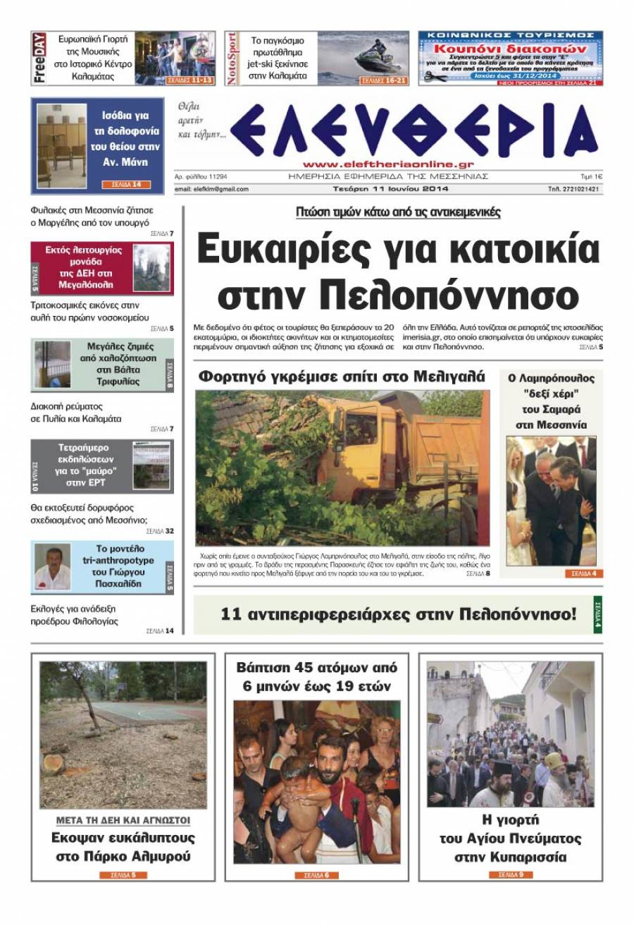 Το πρωτοσέλιδο της "Ελευθερίας" της Τετάρτης 11 Ιουνίου 2014 Για να κατεβάσετε το αρχείο πατήστε πάνω στο κουμπί που γράφει download pdf
