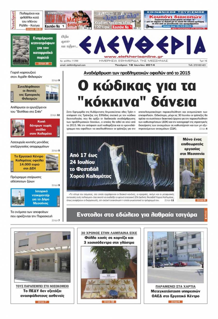 Το πρωτοσέλιδο της "Ελευθερίας" της Τετάρτης 18 Ιουνίου 2014 Για να κατεβάσετε το αρχείο πατήστε πάνω στο κουμπί που γράφει download pdf