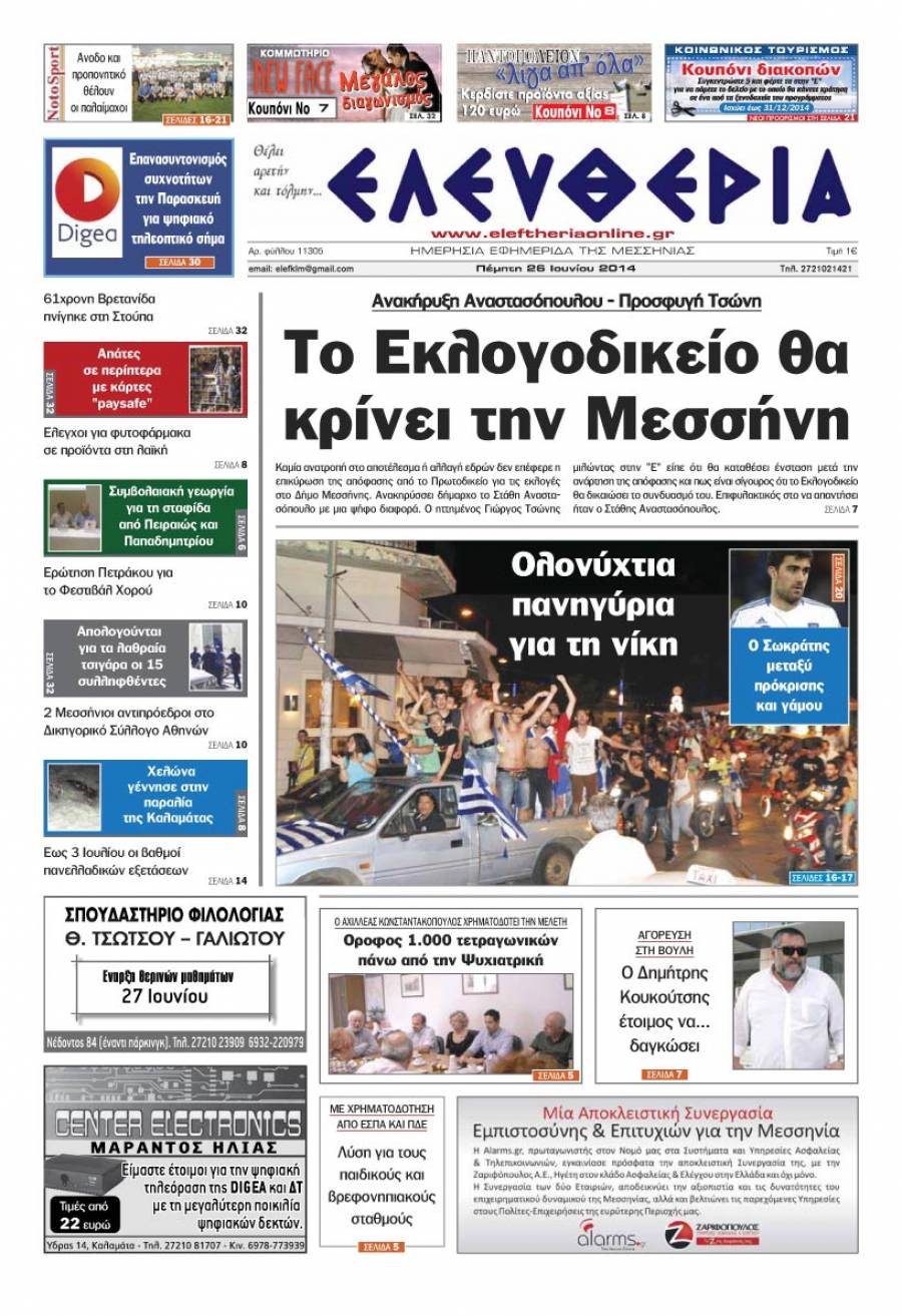 Το πρωτοσέλιδο της "Ελευθερίας" της Πέμπτης 26 Ιουνίου 2014 Για να κατεβάσετε το αρχείο πατήστε πάνω στο κουμπί που γράφει download pdf