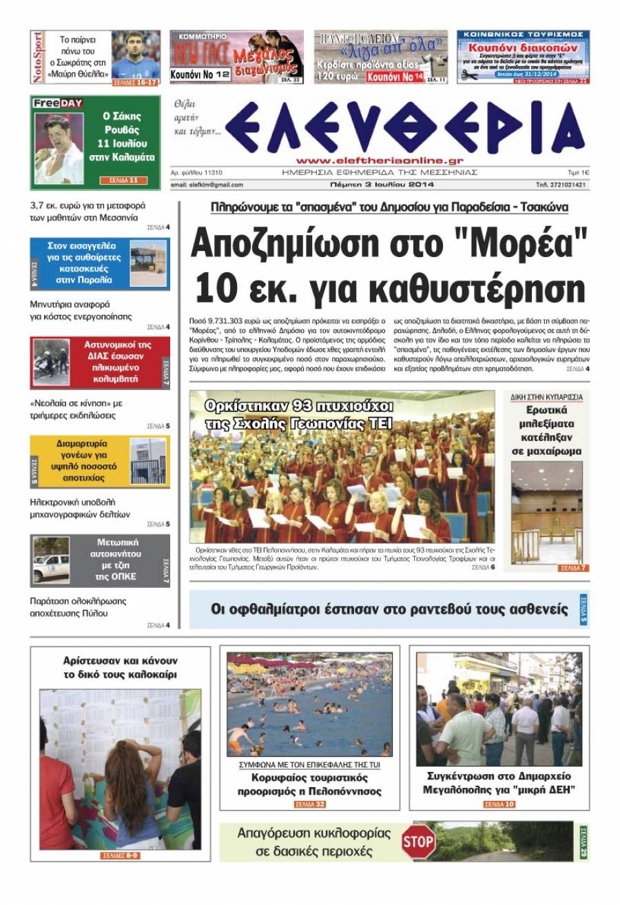 Το πρωτοσέλιδο της "Ελευθερίας" της Πέμπτης 3 Ιουλίου 2014 Για να κατεβάσετε το αρχείο πατήστε πάνω στο κουμπί που γράφει download pdf