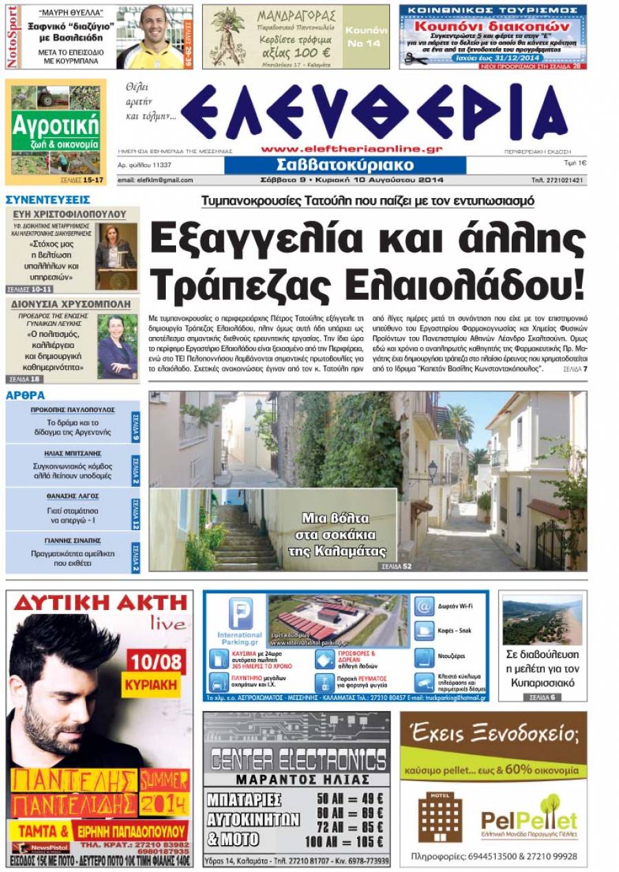 Το πρωτοσέλιδο της "Ελευθερίας" Σαββατοκύριακο 9-10 Aυγούστου 2014 Για να κατεβάσετε το αρχείο πατήστε πάνω στο κουμπί που γράφει download pdf