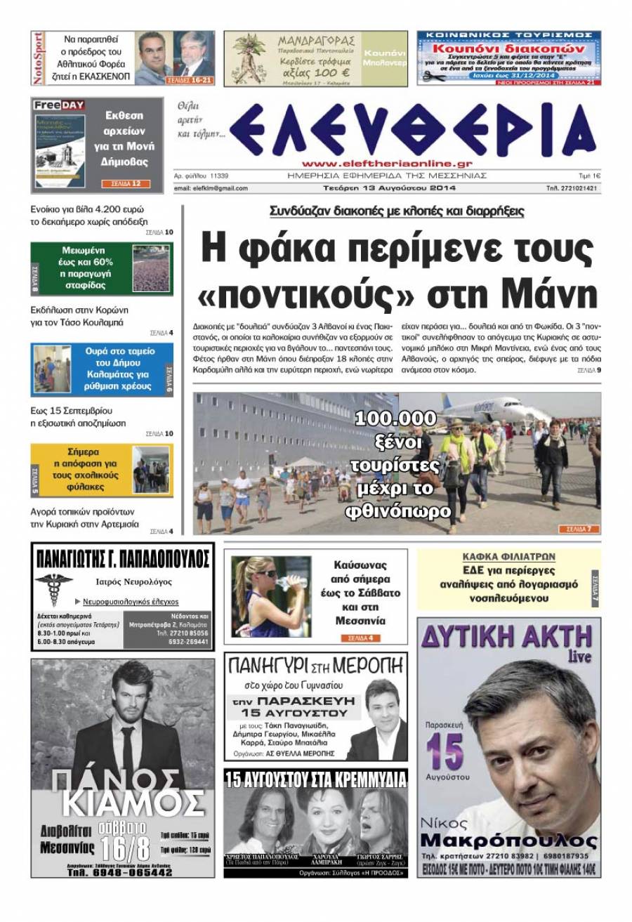 Το πρωτοσέλιδο της "Ελευθερίας" της Τετάρτης 13 Αυγούστου 2014 Για να κατεβάσετε το αρχείο πατήστε πάνω στο κουμπί που γράφει download pdf