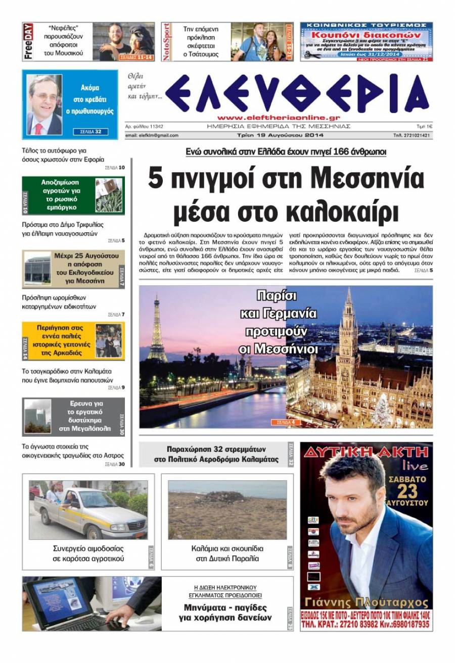 Το πρωτοσέλιδο της "Ελευθερίας" της Τρίτης 19 Αυγούστου 2014 Για να κατεβάσετε το αρχείο πατήστε πάνω στο κουμπί που γράφει download pdf