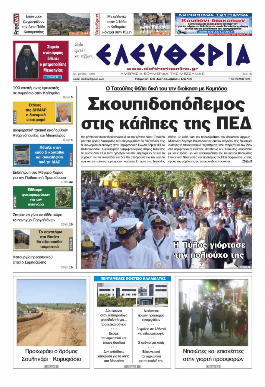 Το πρωτοσέλιδο της "Ελευθερίας" της Πέμπτης 25 Σεπτεμβρίου 2014 Για να κατεβάσετε το αρχείο πατήστε πάνω στο κουμπί που γράφει download pdf