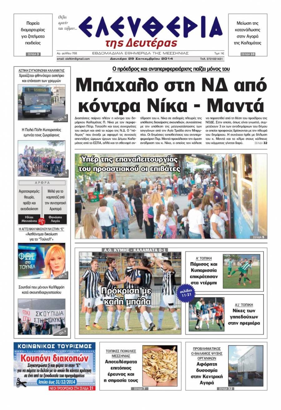 Το πρωτοσέλιδο της "Ελευθερίας της Δευτέρας" 29 Σεπτεμβρίου 2014 Για να κατεβάσετε το αρχείο πατήστε πάνω στο κουμπί που γράφει download pdf