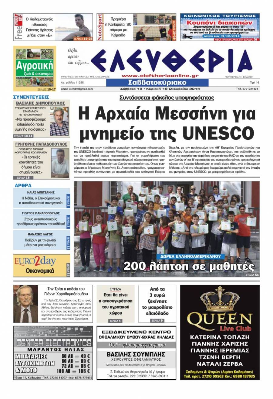 Το πρωτοσέλιδο της "Ελευθερίας" Σαββατοκύριακο 18-19 Oκτωβρίου 2014