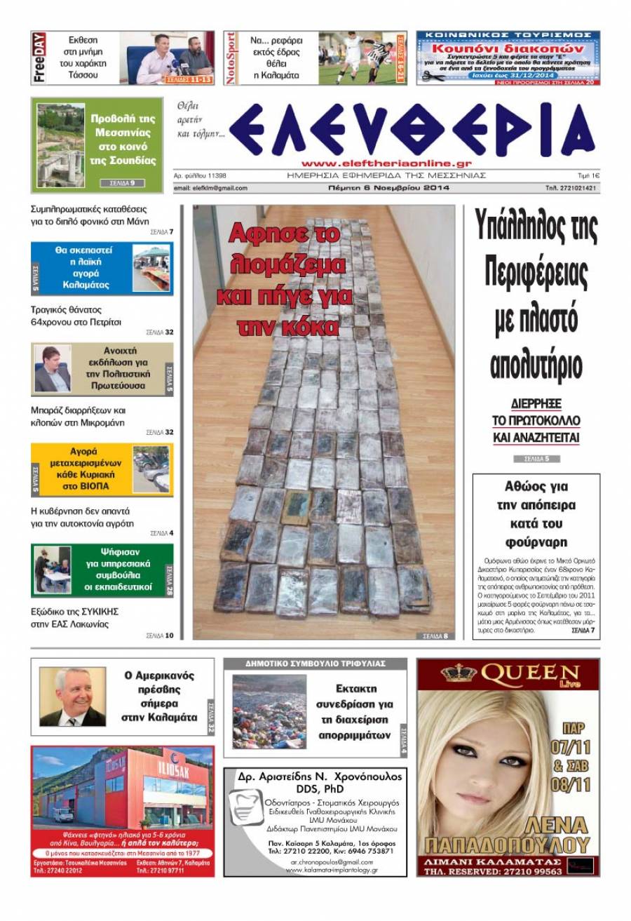 Το πρωτοσέλιδο της "Ελευθερίας" Πέμπτη 6 Νοεμβρίου 2014 Για να κατεβάσετε το αρχείο πατήστε πάνω στο κουμπί που γράφει download pdf