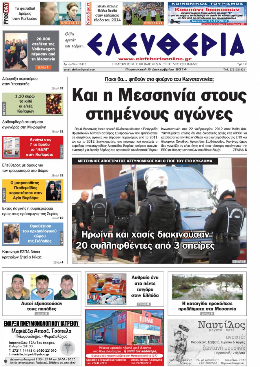 Το πρωτοσέλιδο της "Ελευθερίας" Παρασκευή 5 Δεκεμβρίου 2014 Για να κατεβάσετε το αρχείο πατήστε πάνω στο κουμπί που γράφει download pdf