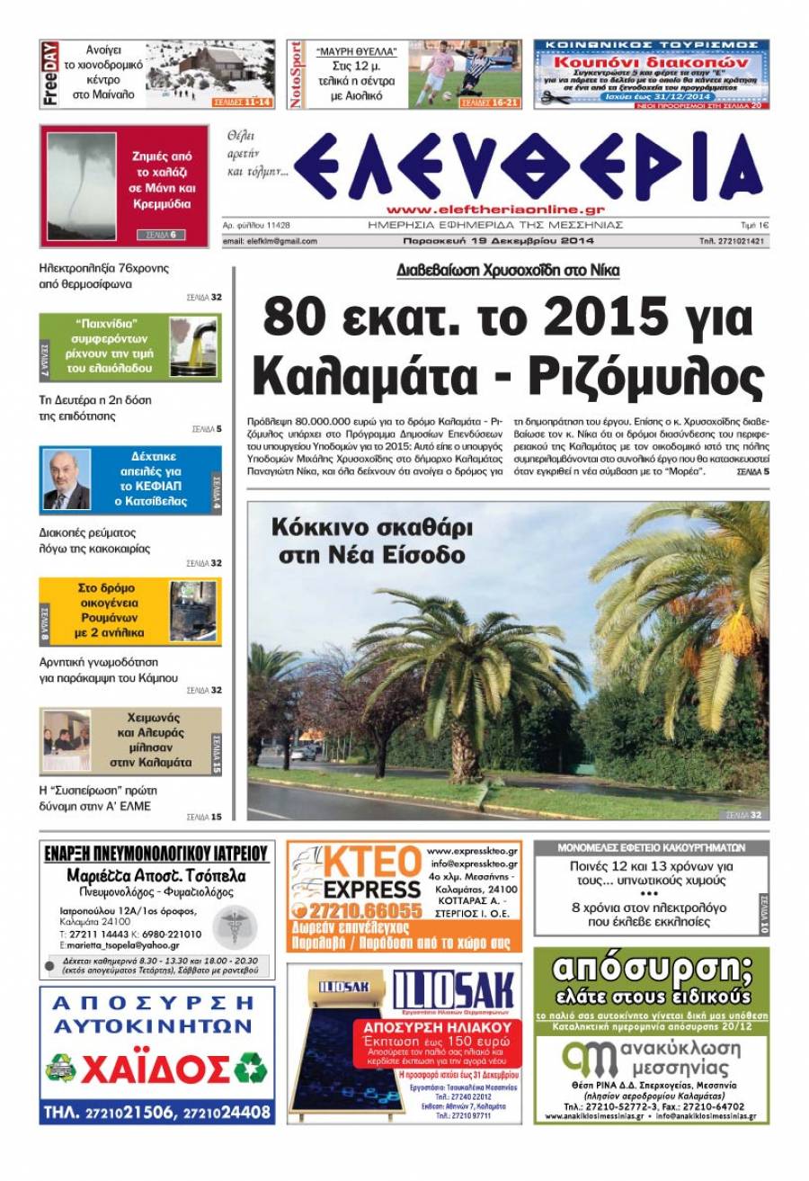 Το πρωτοσέλιδο της "Ελευθερίας" Παρασκευή 19 Δεκεμβρίου 2014 Για να κατεβάσετε το αρχείο πατήστε πάνω στο κουμπί που γράφει download pdf