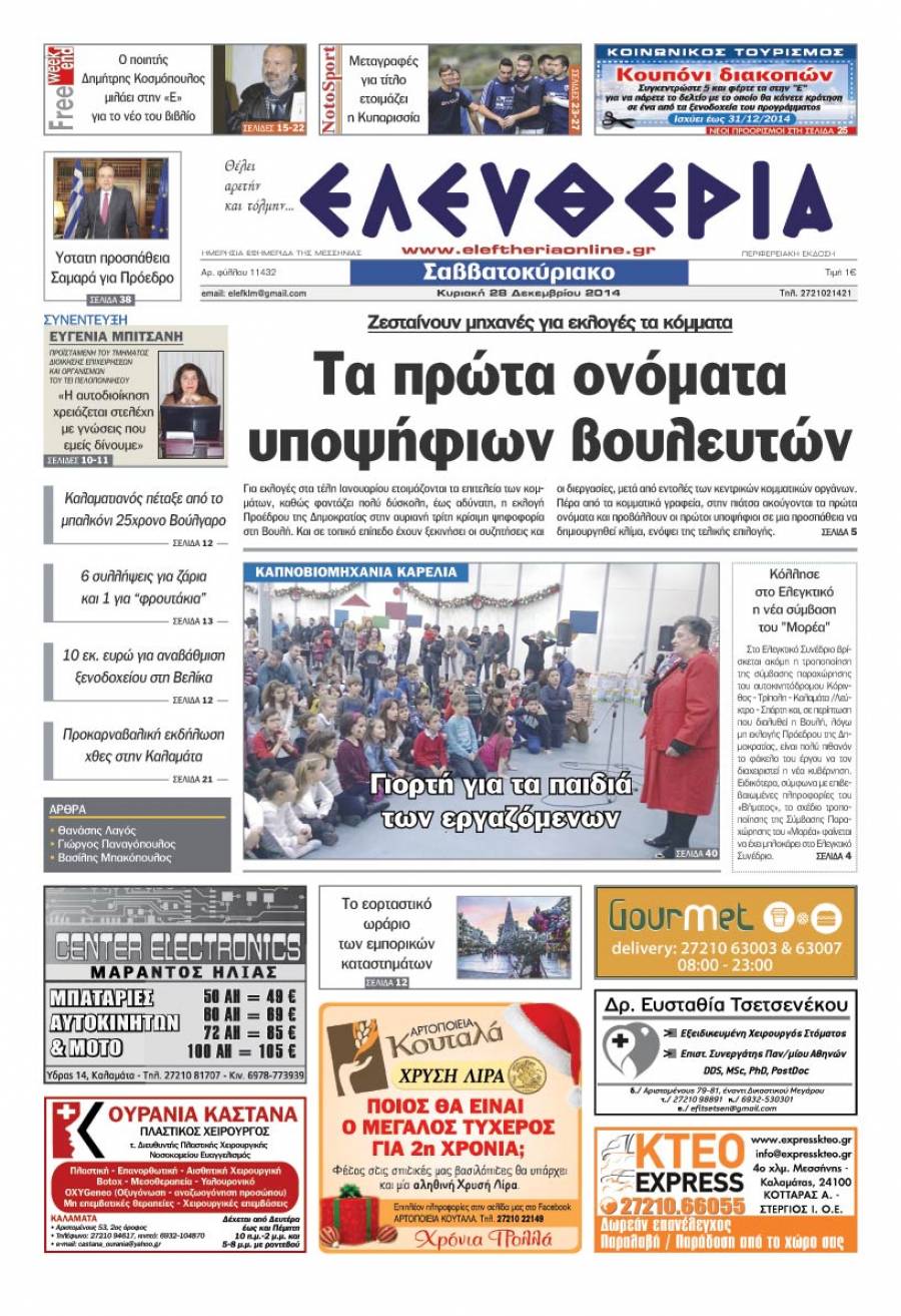 Το πρωτοσέλιδο της "Ελευθερίας" Σαββατοκύριακο 27-28 Δεκεμβρίου 2014