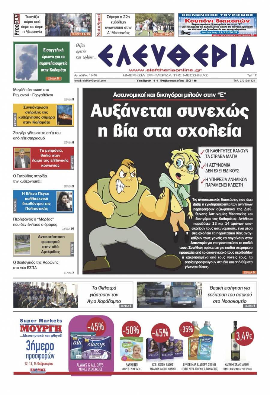 Το πρωτοσέλιδο της "Ελευθερίας" της Τετάρτης 11 Φεβρουαρίου 2015 Για να κατεβάσετε το αρχείο πατήστε πάνω στο κουμπί που γράφει download pdf