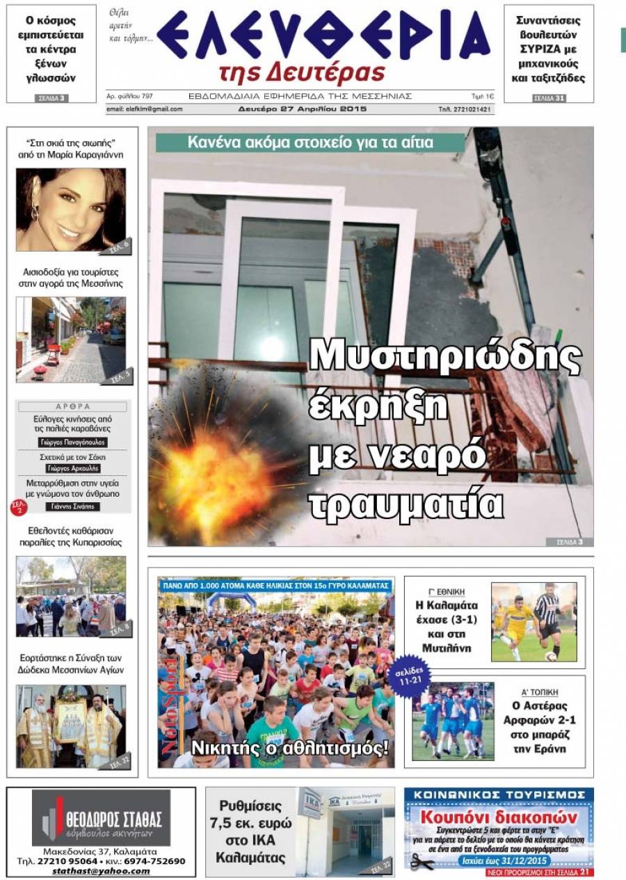 Το πρωτοσέλιδο της "Ελευθερίας" Δευτέρα 27 Απριλίου 2015 Για να κατεβάσετε το αρχείο πατήστε πάνω στο κουμπί που γράφει download pdf