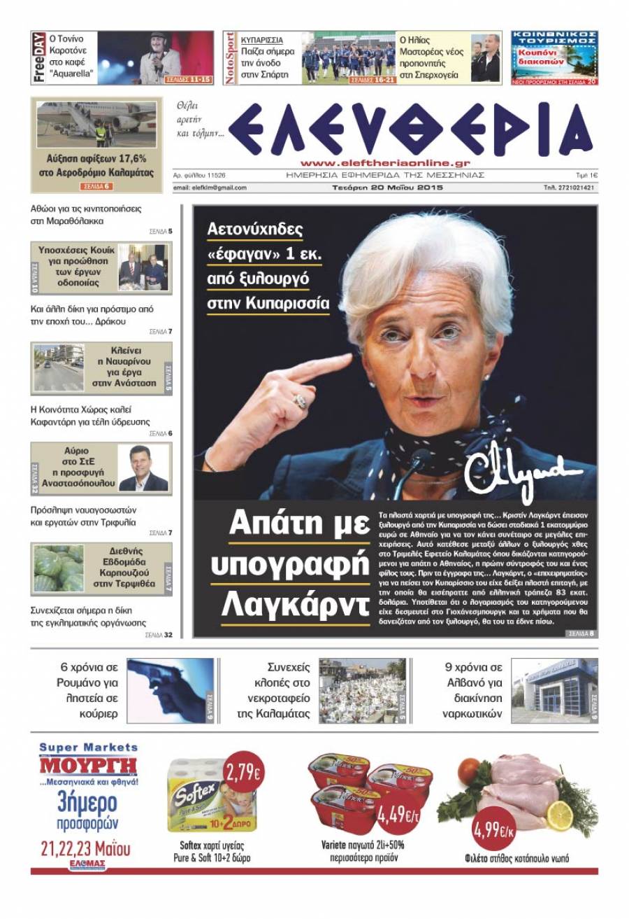 Το πρωτοσέλιδο της "Ελευθερίας - Τετάρτη 20 Μαΐου 2015 Για να κατεβάσετε το αρχείο πατήστε πάνω στο κουμπί που γράφει download pdf