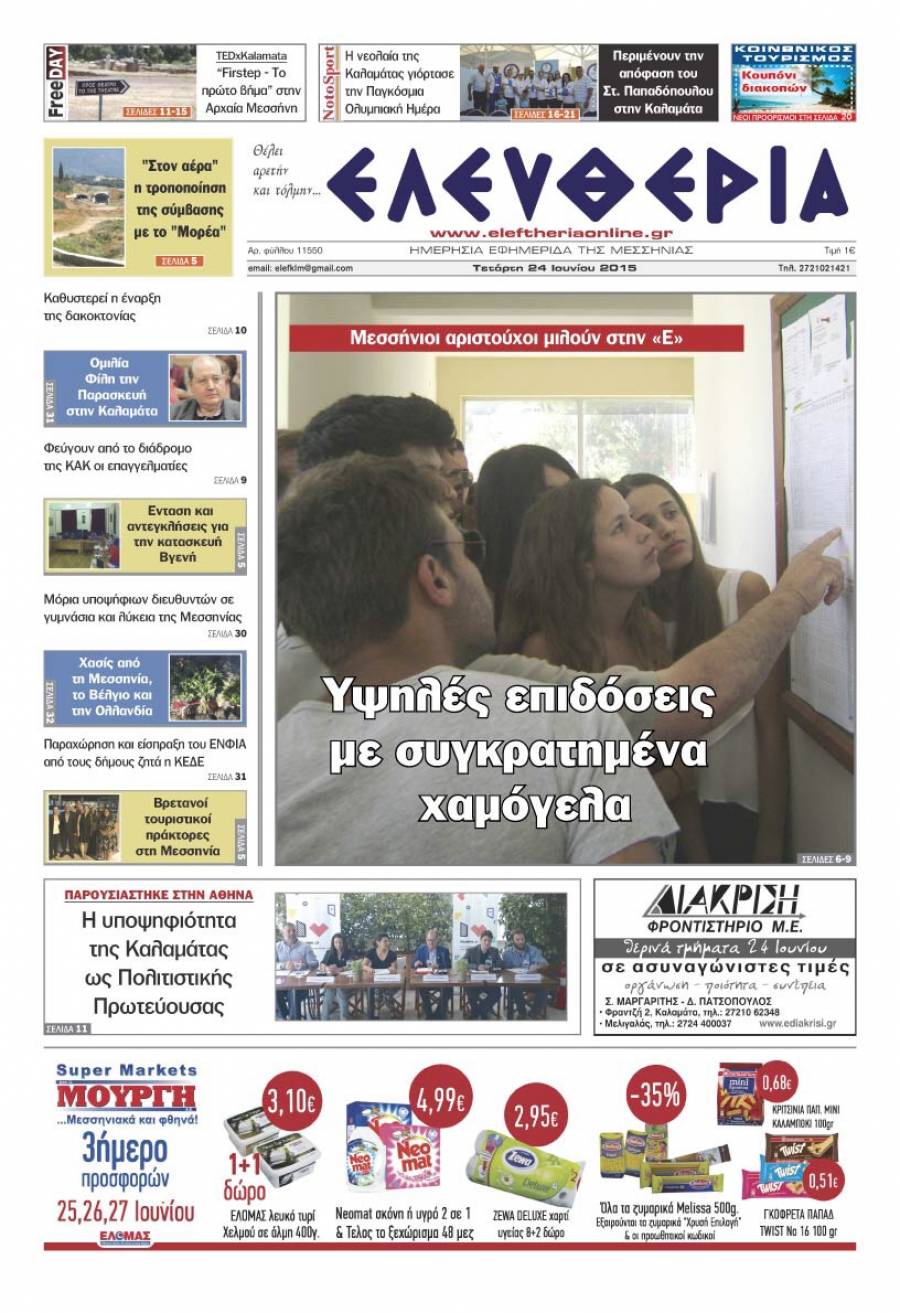 Το πρωτοσέλιδο της "Ελευθερίας" Τετάρτη 24 Ιουνίου 2015 Για να κατεβάσετε το αρχείο πατήστε πάνω στο κουμπί που γράφει download pdf