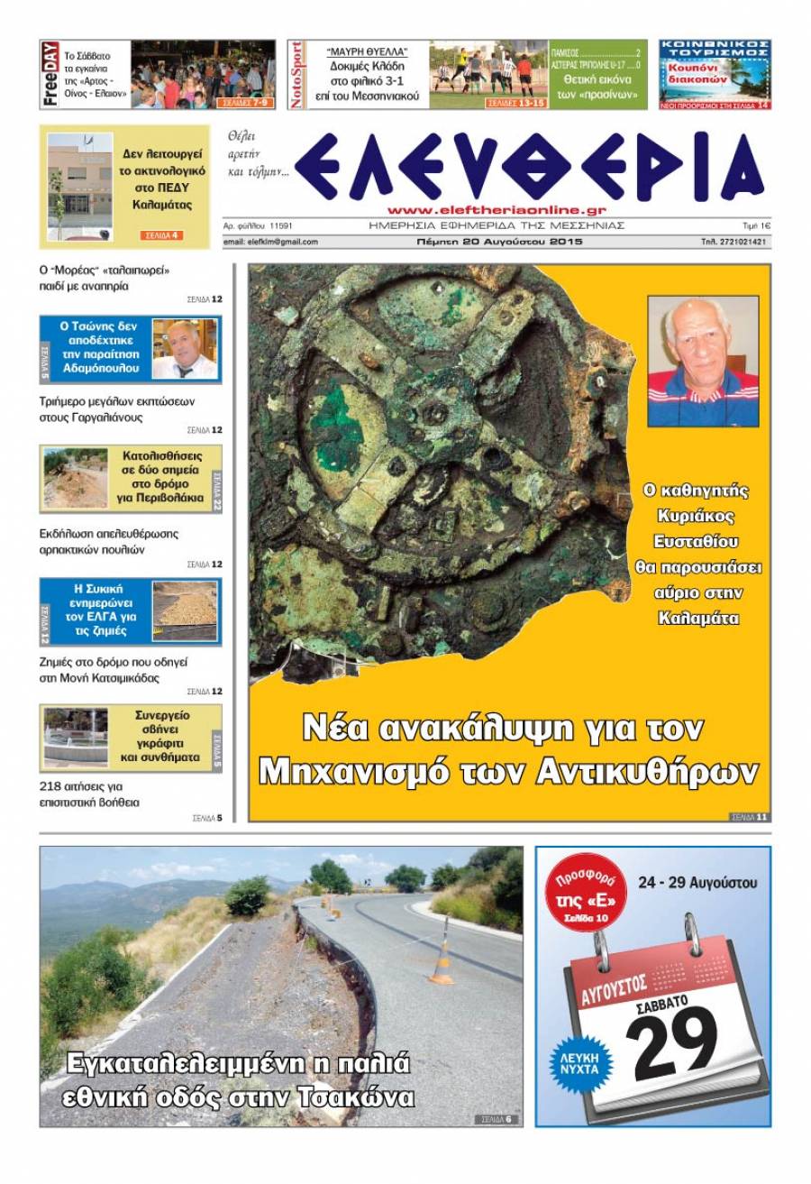 Το πρωτοσέλιδο της "Ελευθερίας" - Πέμπτη 20 Αυγούστου 2015 Για να κατεβάσετε το αρχείο πατήστε πάνω στο κουμπί που γράφει download pdf