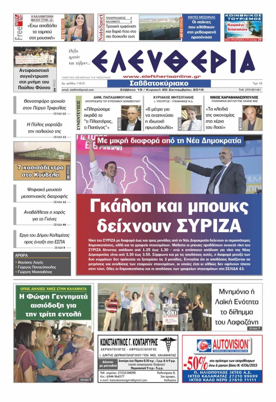 Το πρωτοσέλιδο της "Ελευθερίας Σαββατοκύριακο" 19-20 Σεπτεμβρίου 2015