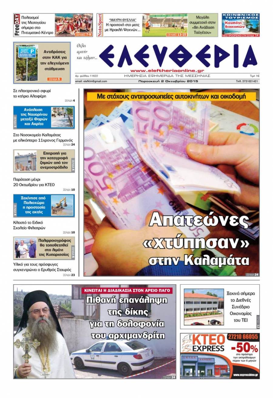 Το πρωτοσέλιδο της "Ελευθερίας" - Παρασκευή 2 Οκτωβρίου 2015 Για να κατεβάσετε το αρχείο πατήστε πάνω στο κουμπί που γράφει download pdf