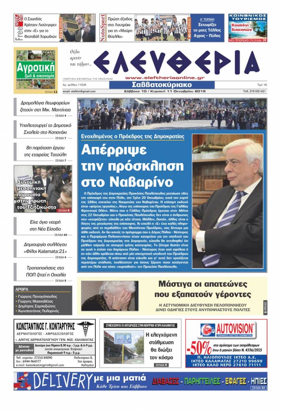 Το πρωτοσέλιδο της "Ελευθερίας Σαββατοκύριακο" 10-11 Οκτωβρίου 2015